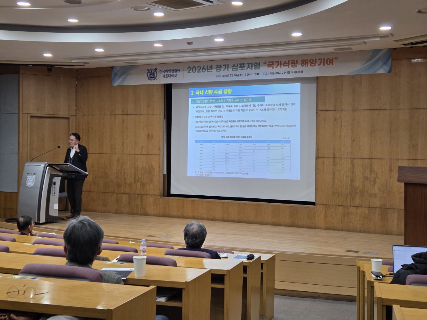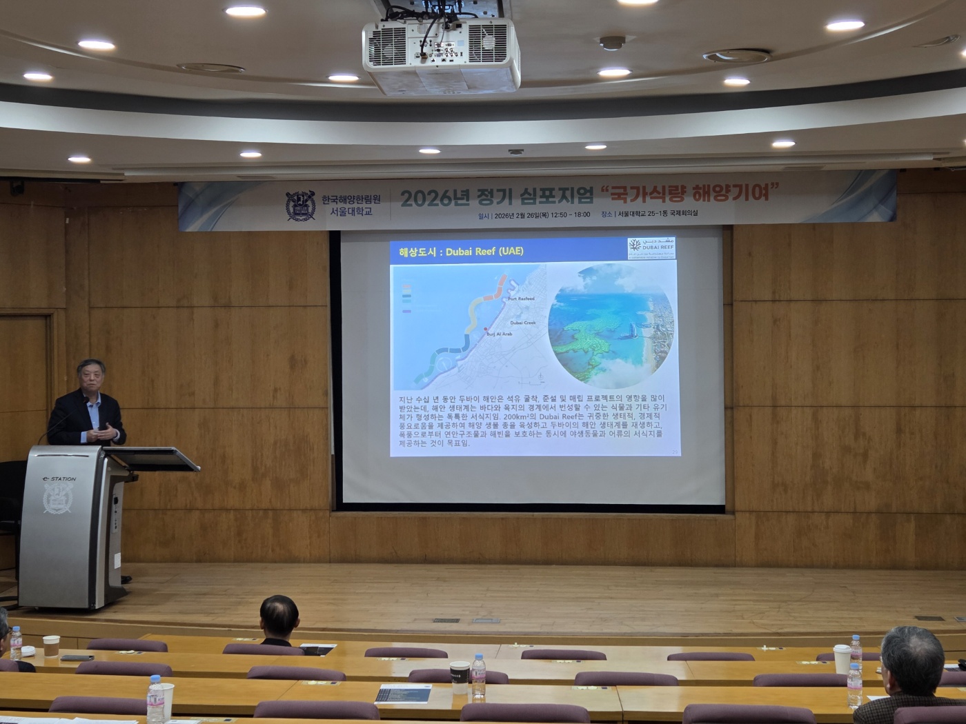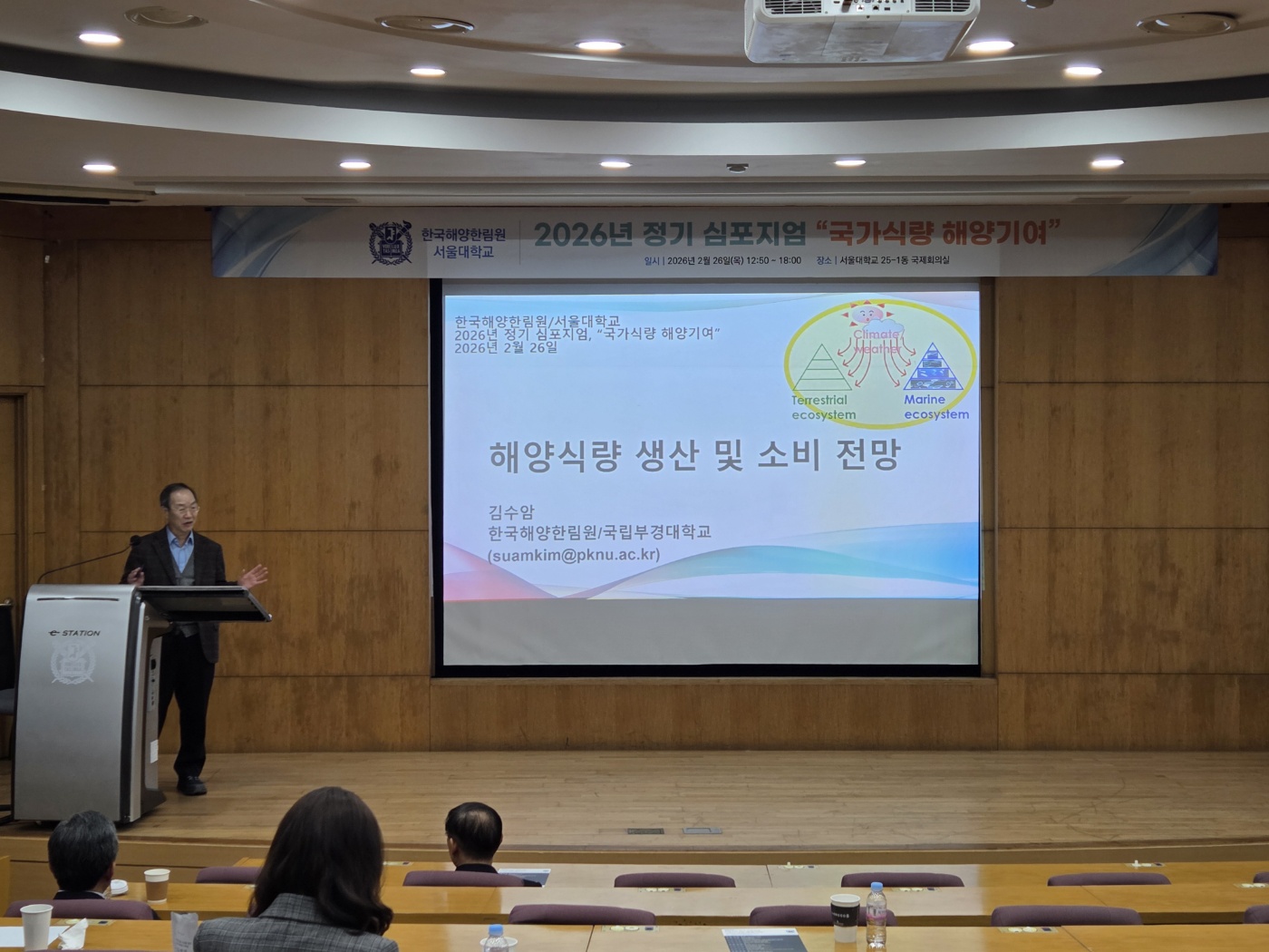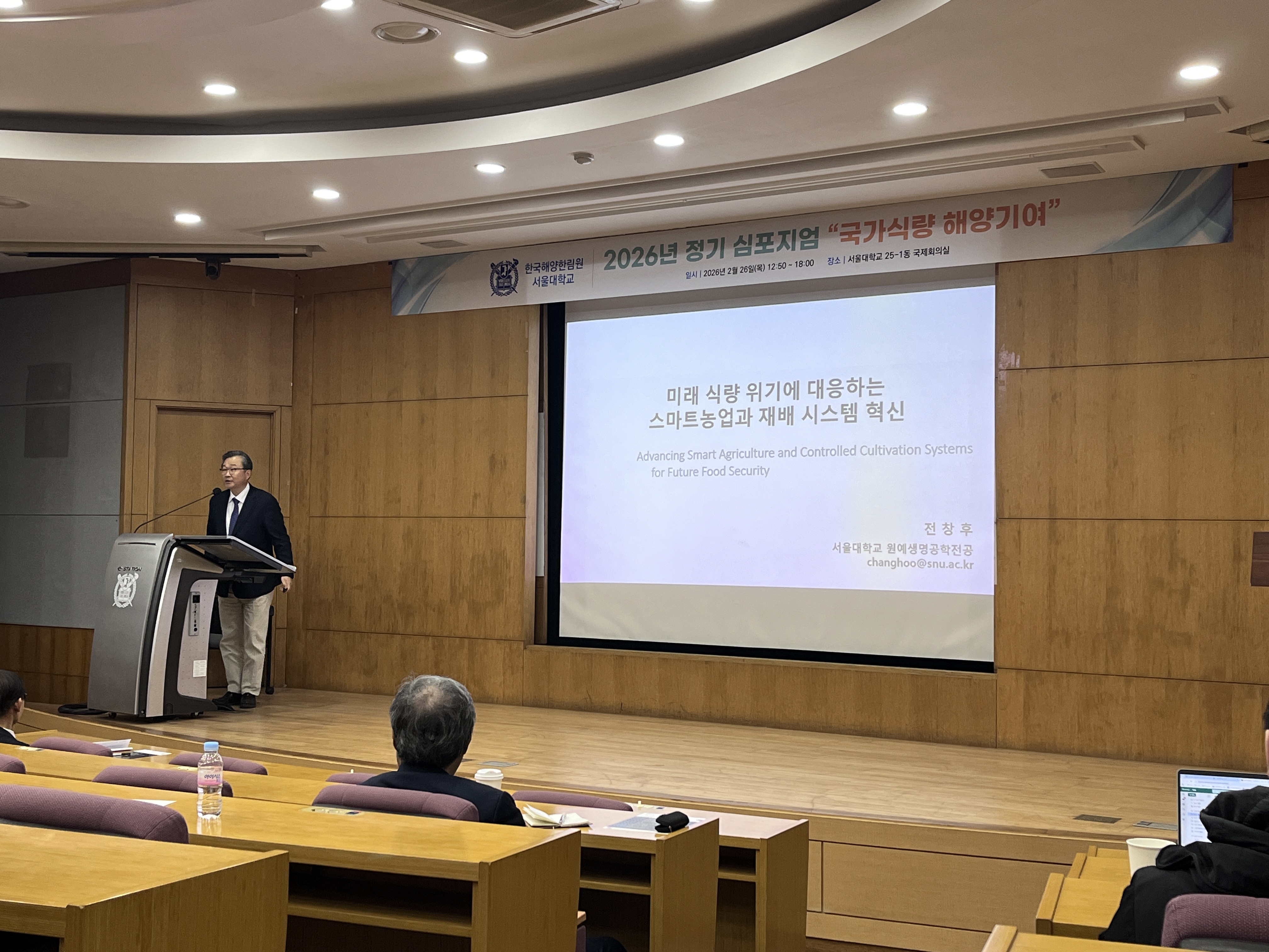 2026년 2월 26일 서울대학교 25-1동 국제회의실에서 "국가식량 해양기여"를 주제로 한국해양한림원 2026년 정기 심포지엄이 개최되었습니다. 이번 심포지엄은 한국해양한림원 회장님이신 서울대학교 정해진 교수님의 개회로 시작하였고 한양대학교 예상욱 교수님의 사회로 진행되었습니다.