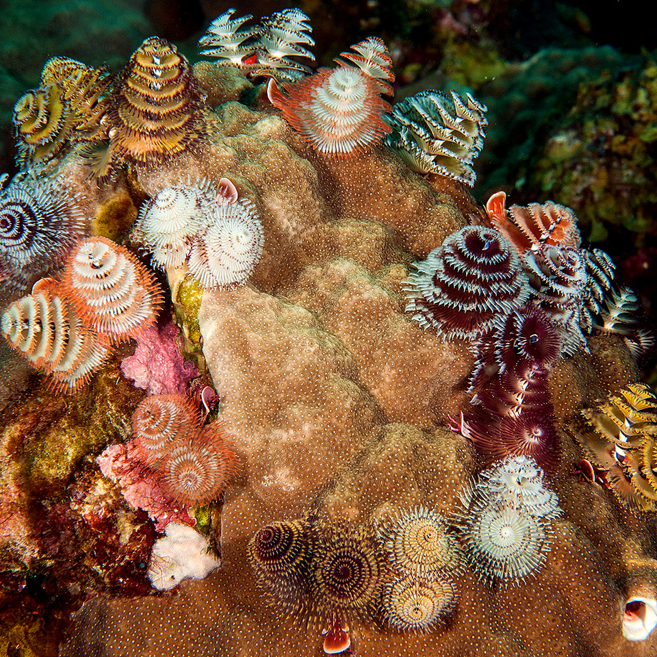 <혹산호 위 크리스마스트리벌레; 출처: PADI>이 작은 벌레는 산호와 미묘한 공생 관계를 맺고 있습니다. 산호 위에 정착해 보호를 받는 대신, 물을 걸러 먹이를 먹으면서 주변 물을 순환시키고, 때로는 관 주변에 붙는 조류가 산호 조직을 자극해 상처를 키우기도 합니다. 그래서 크리스마스트리벌레가 많이 살고 있는 산호를 조사하면, 그 산호가 어떤 환경 스트레스를 받고 있는지 간접적으로 짐작할 수 있다는 흥미로운 연구 결과도 나오고 있습니다.